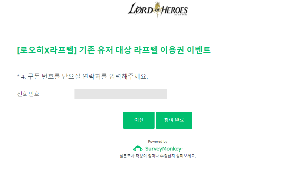 위의 모든 조건을 달성하신 분은 아래 설문지(?)를 작성하시면 됩니다. 모든 절차를 끝내신 신규 유저는 8월 27일(금)에 '라프텔 30일 이용권' 쿠폰을 지급 받으실 수 있습니다.