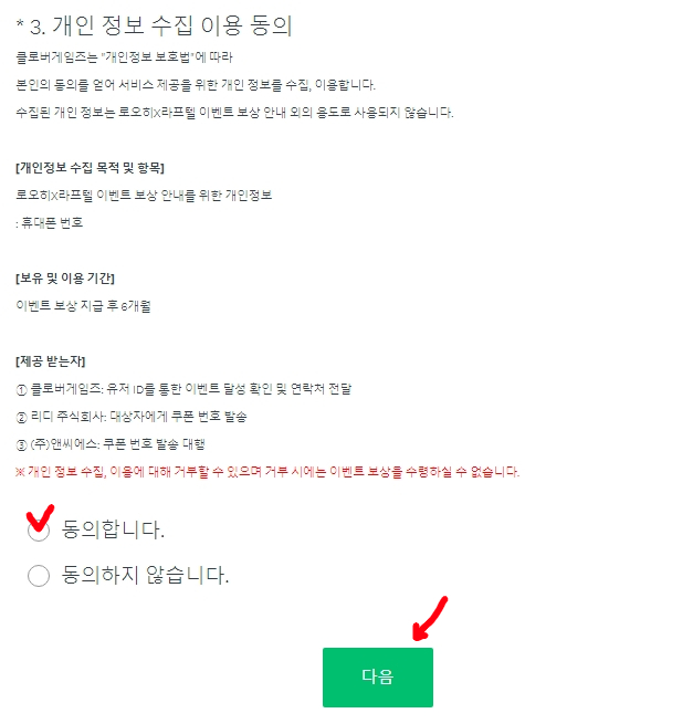 그리고 개인 정보 수집에 동의를 누릅니다.
