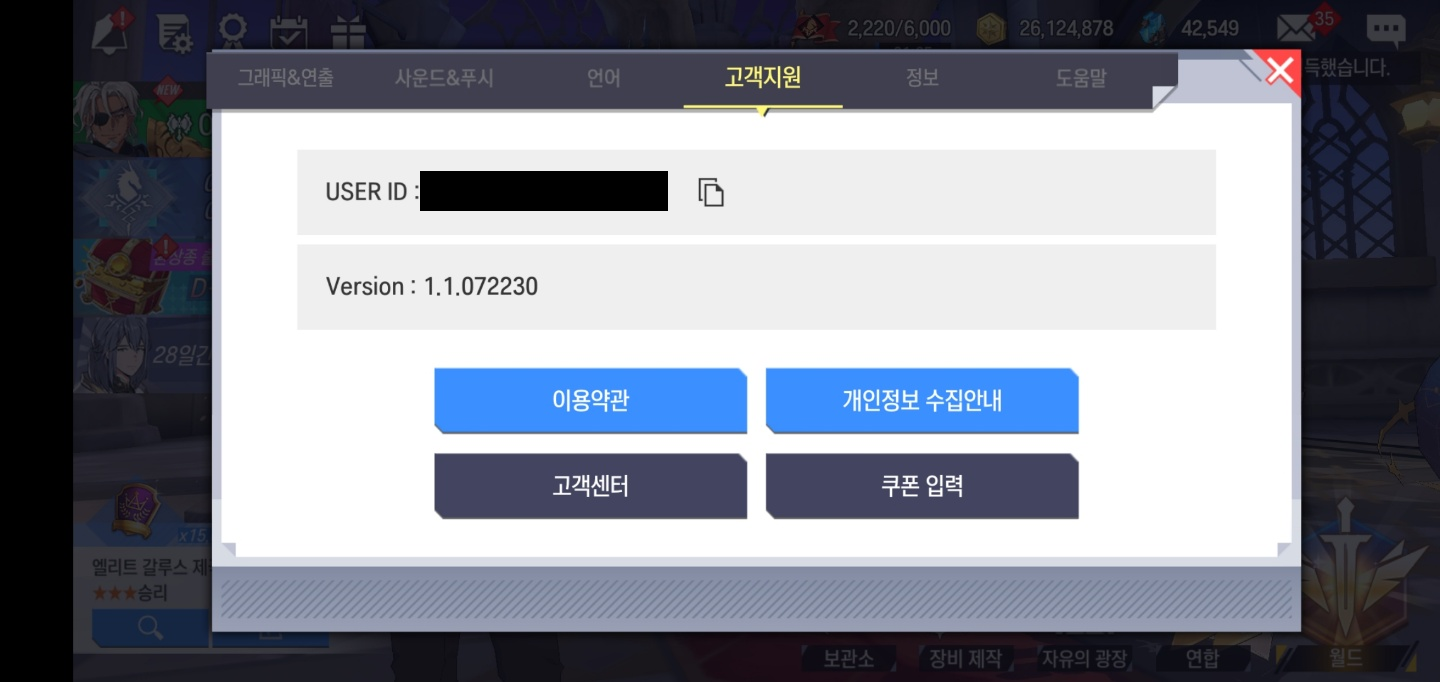 검은 동그라미의 설정에 들어가면 위에 메뉴 중에 고객지원 메뉴가 있습니다. 누르면 'USER ID'가 나오고 옆에 종이가 겹쳐진 버튼을 누르면 복사가 됩니다.