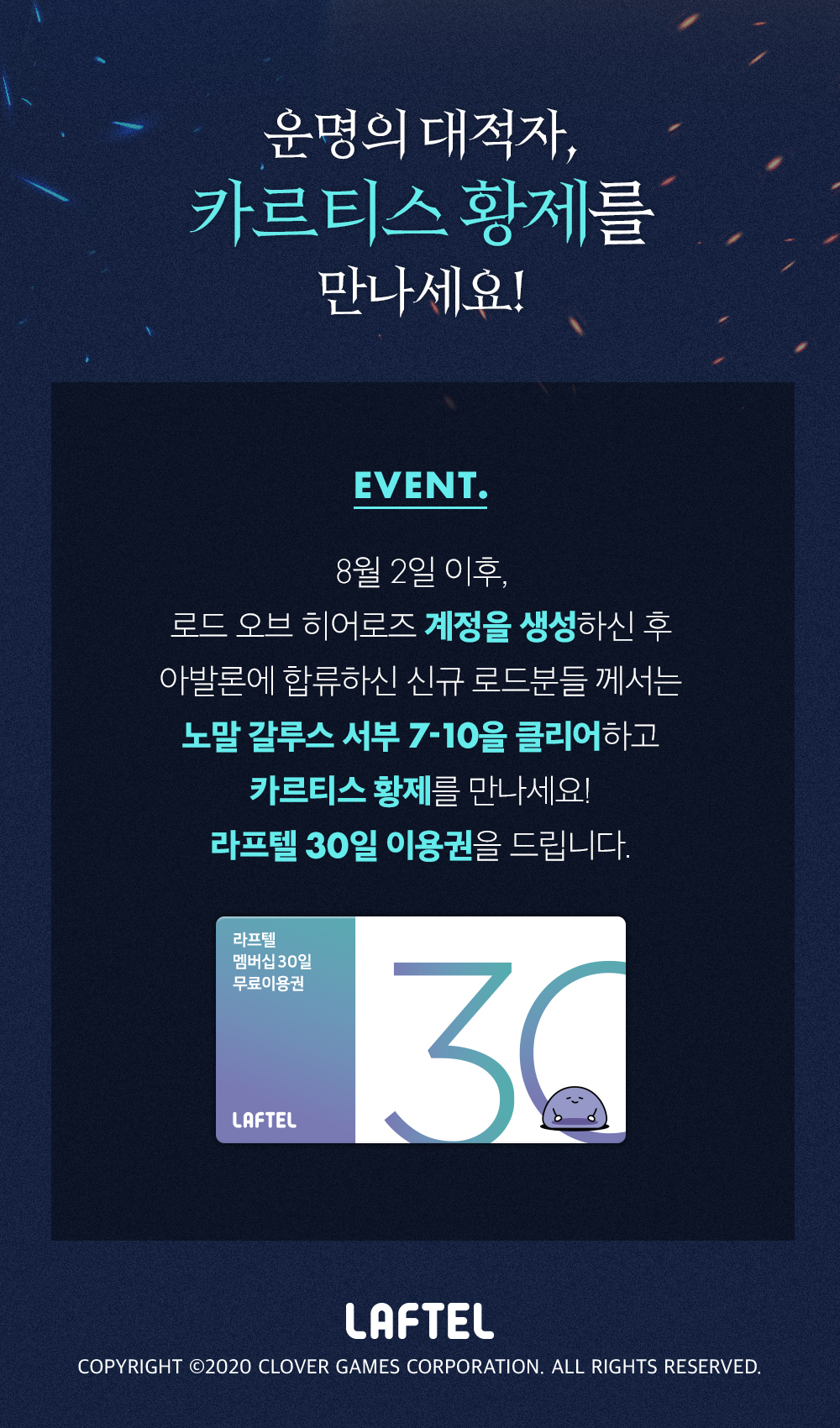 8월 2일에 공개한 '로드 오브 히어로즈'와 '라프텔'의 콜라보! 최근 게임 공지사항이나 소식같은걸 잘 확인 안해서 모르고 있었는데 게임에 접속하면 가장 먼저 보여주는 게임 소식 창에 예상치 못한 내용의 이벤트가 떴더라고요.