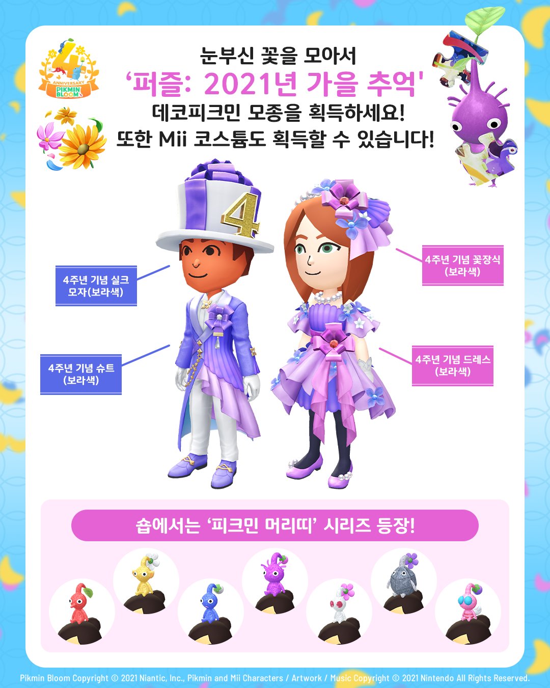 Pikmin Bloom에도 어느새 4주년을 기념할 순간이 찾아왔습니다. 전부 유저 여러분 덕분이에요! 피크민과 매일같이 나서는 산책, 그리고 지금까지 심어주신 수많은 꽃들이 이 여정을 더욱 특별하게