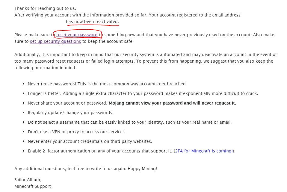 결국 고객센터에 여러 가지를 검색하다가 겨우 고객센터에 문의를 넣을 수 있었는데 계정을 찾을 수 없고 메일도 받을 수 없다고 그냥 번역기에 돌리고 나서 보내니 하루 정도 뒤에 답장이 왔다. 며칠 동안의 고생의 원인은 계정이 휴먼 상태라는 것이었다. 메일로 휴먼 상태를 풀어두었다고 답장 중 내용이 적혀 있었고 비밀번호를 찾는 페이지에서 비밀번호를 바꾸려고 하자 이제서야 메일이 바로 도착했다.