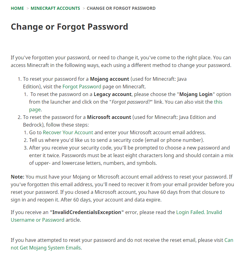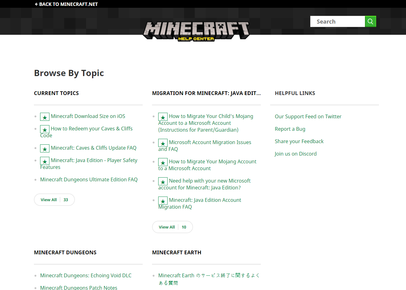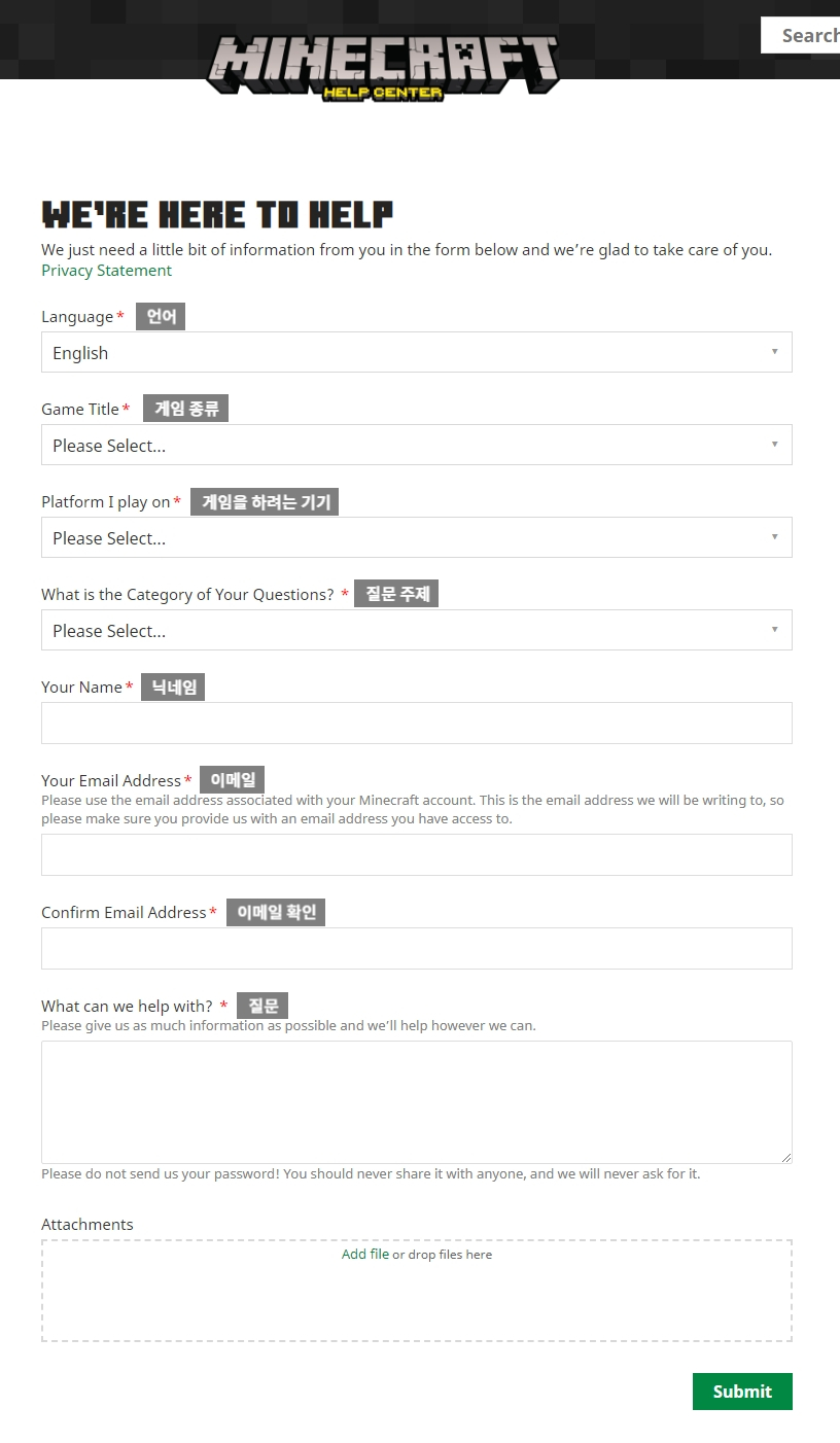 그래서 결국 마인크래프트의 공식 홈페이지의 고객센터에 들어가 보았는데 위에 방법들을 시도하면서도 계속 고객센터를 방문했었는데 다른 곳은 한국어를 지원하는데 중요한 고객센터에서는 한국어를 지원하지 않는다. 나같이 영어실력이 좋지 못한 사람에게는 이 부분이 이 글의 맨 아래에 적어놓은 마인크래프트의 공식 사이트에 대한 불만들 중 하나이다.